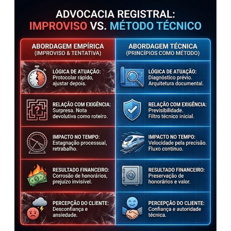 Essa lógica transforma o procedimento registral em um jogo de tentativa e erro, no qual cada erro custa prazo, desgaste e dinheiro. O advogado perde o controle do caso e transfere, implicitamente, a condução técnica para o cartório, esperando que a qualificação negativa funcione como roteiro corretivo. Isso é a negação da advocacia técnica.