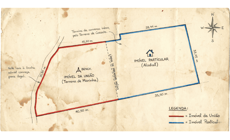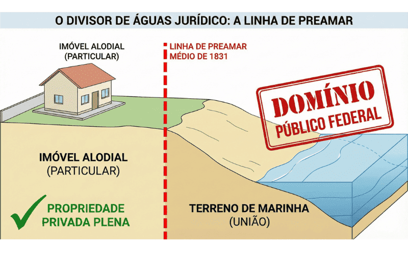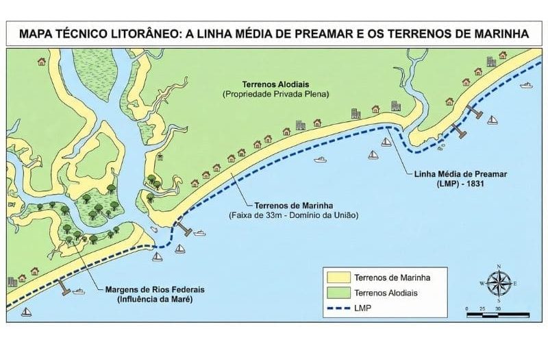 A linha demarcatória é o divisor técnico entre o que pode ser regularizado como imóvel privado e o que jamais será usucapido ou consolidado extrajudicialmente. Ela não é mera abstração histórica. É instrumento administrativo com efeitos jurídicos concretos, definido a partir do preamar médio de 1831, com atualizações e procedimentos próprios conduzidos pela Secretaria do Patrimônio da União.