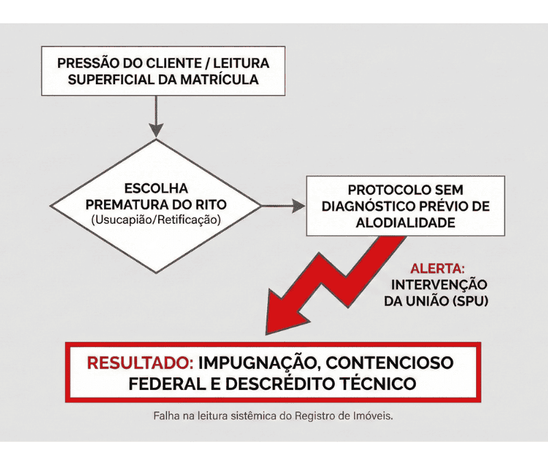 No caso de imóveis potencialmente não alodiais, a escolha da usucapião é, muitas vezes, um erro técnico insanável. Não se trata de dificuldade probatória. Trata-se de impossibilidade jurídica do pedido. No extrajudicial, o indeferimento é certo. No judicial, o processo pode até tramitar por anos, mas a sentença será de improcedência ou de extinção, com desgaste e custo elevados.